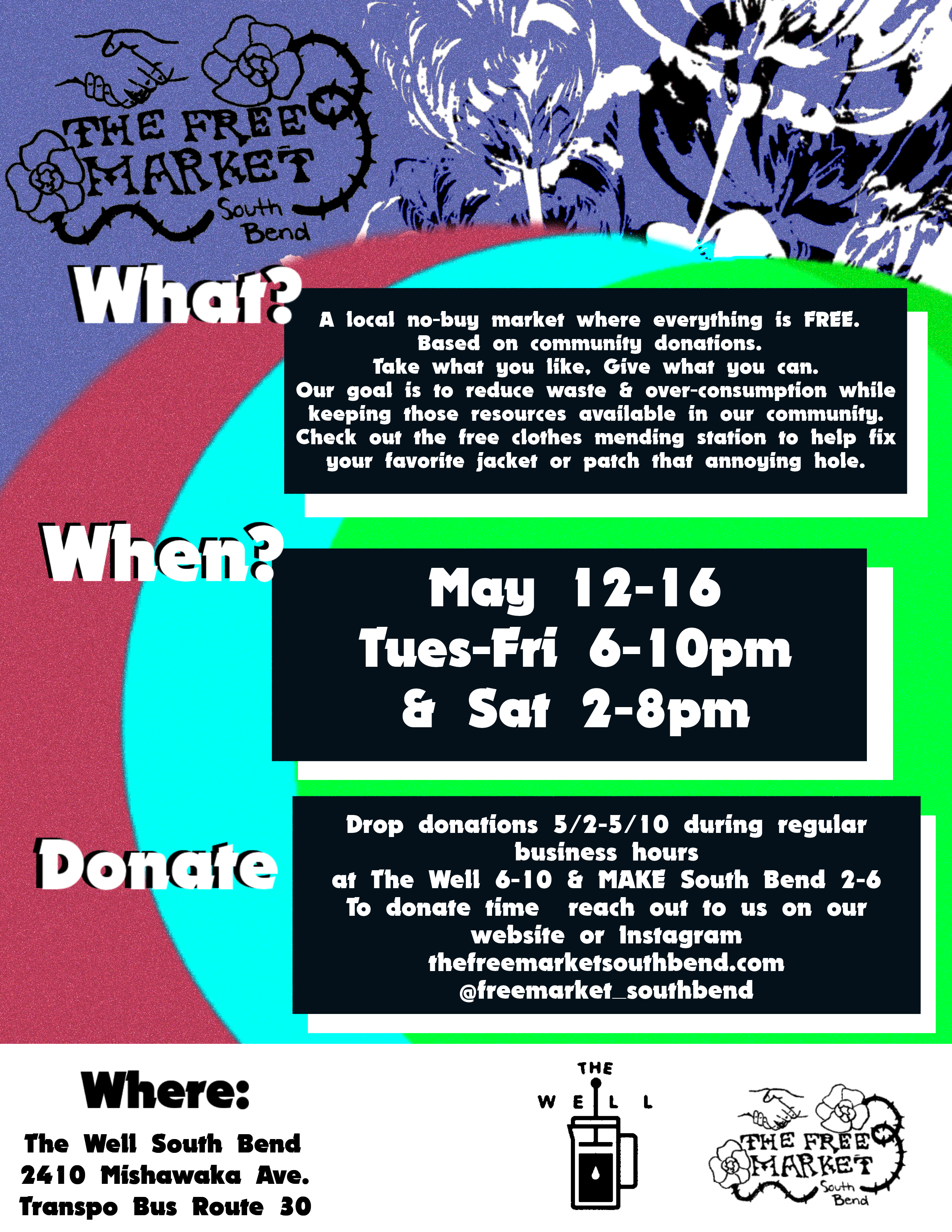 Our large pop-up markets are quarterly events hosted in the warehouse space at the Well Coffee House located in the River Park neighborhood of South Bend Indiana. The market is completely stocked by community donations! Think of it as a thrift store where everything is totally free. We also provide a free cloths mending station sponsored by MAKE South Bend where volunteers will help you with minor garment repairs and alterations. There will also be live music the final day of the market!